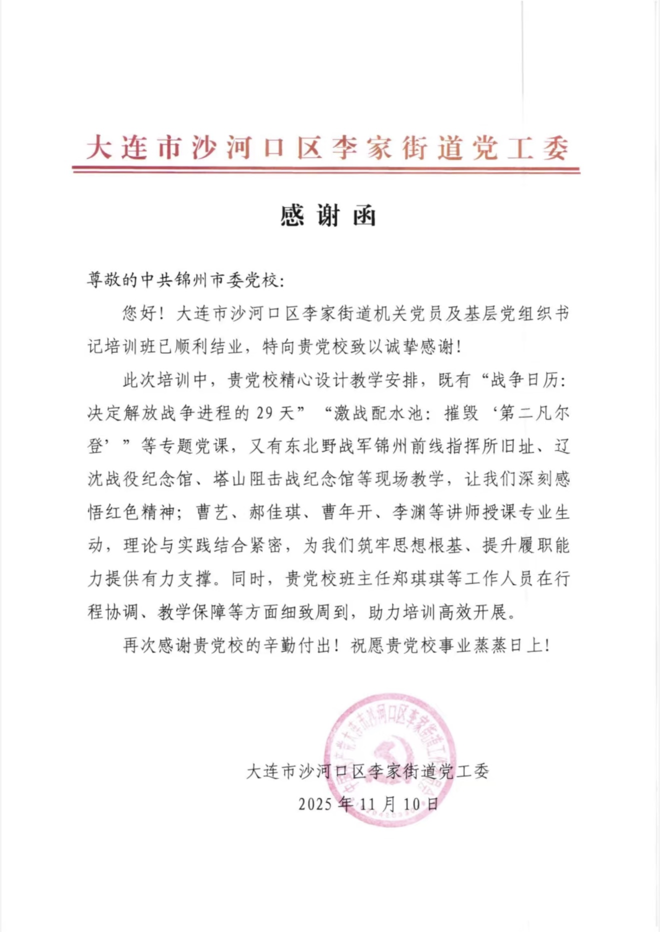 11月,大连市沙河口区李家街道党工委也致信感谢。表示我院精心设计的教学安排让学员们深刻感悟红色精神。授课讲师的专业生动,以及班主任团队的细致保障,为学员筑牢思想根基、提升履职能力提供了有力支撑。