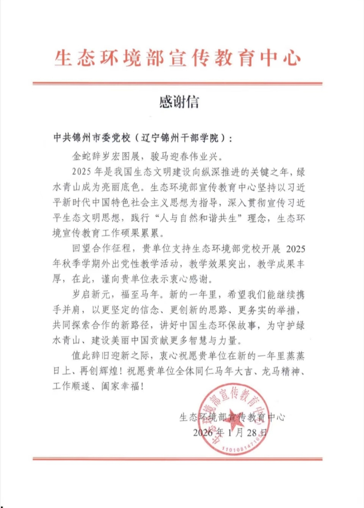 岁末年初,生态环境部宣传教育中心的感谢信温暖而至。信中对学院支持生态环境部党校秋季学期外出党性教学活动取得的突出效果表示衷心感谢,并期待未来继续携手,共同探索合作的新路径。