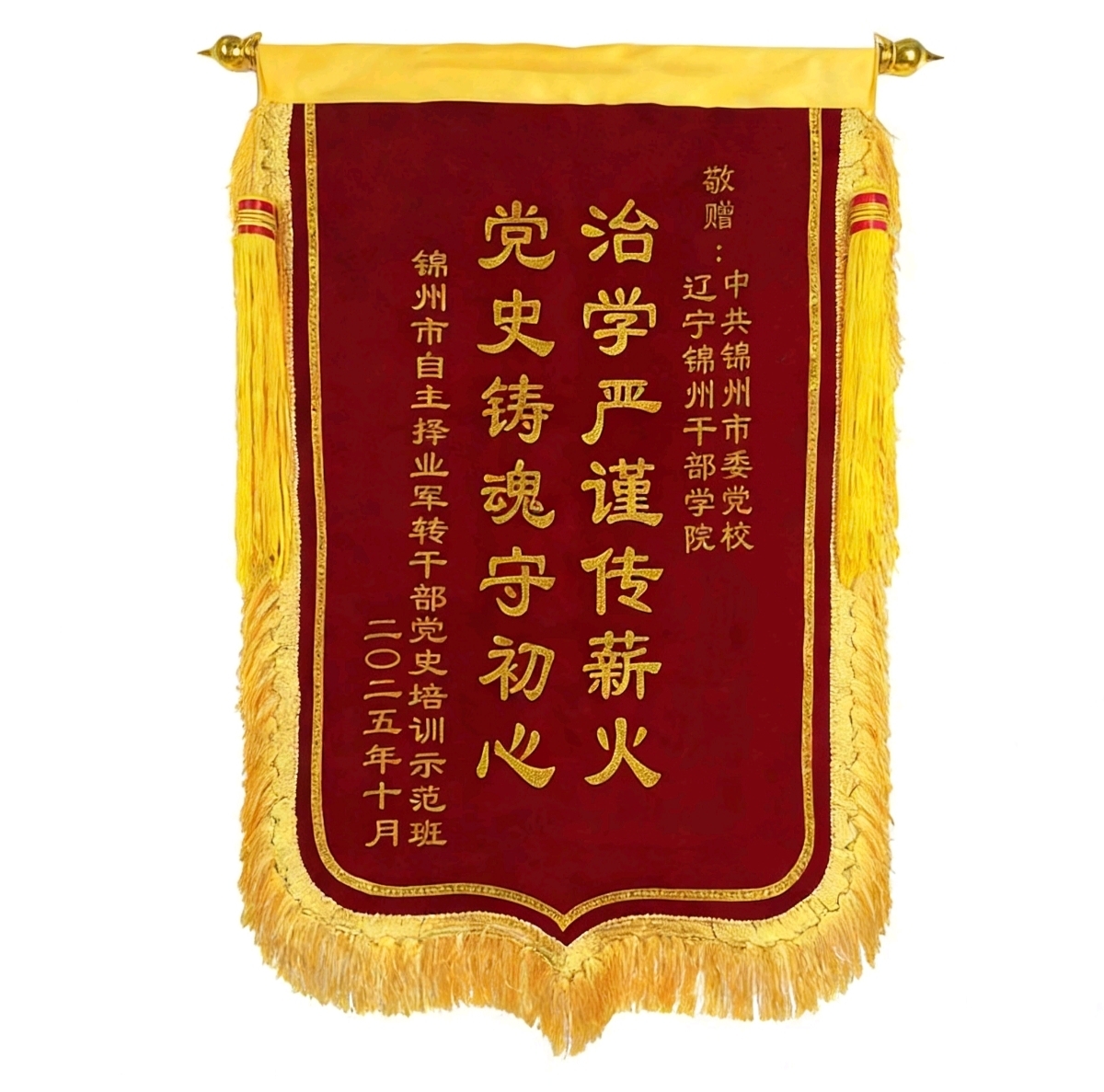 4月,辽宁省锦州监狱送来锦旗,“传道授业 党性教育铸警魂;学思践悟 思想升华启新篇”,凝练了学院在党性教育中的扎实成效。10月,锦州市自主择业军转干部党史培训示范班也送来锦旗,“治学严谨传薪火;党史铸魂守初心”,是对学院深耕红色教育、传承红色基因的最高褒奖。